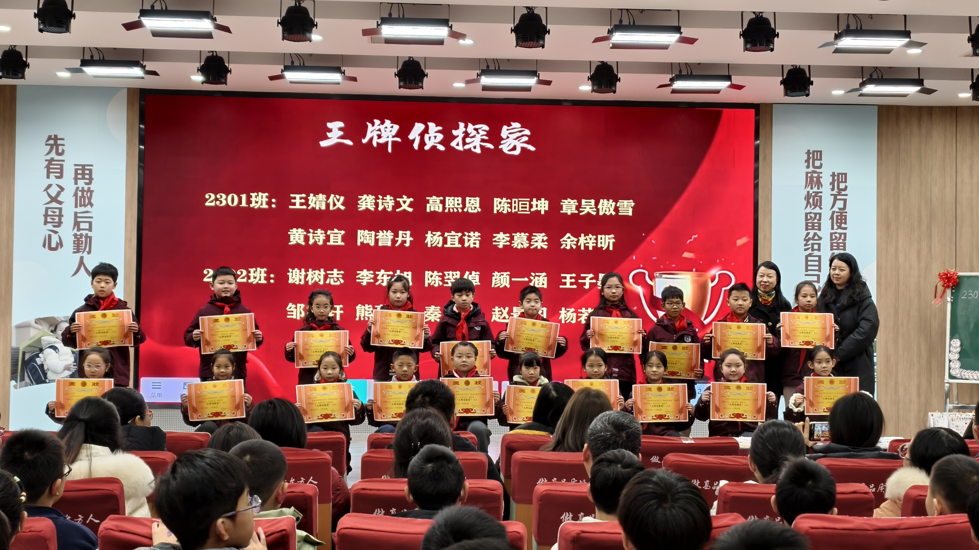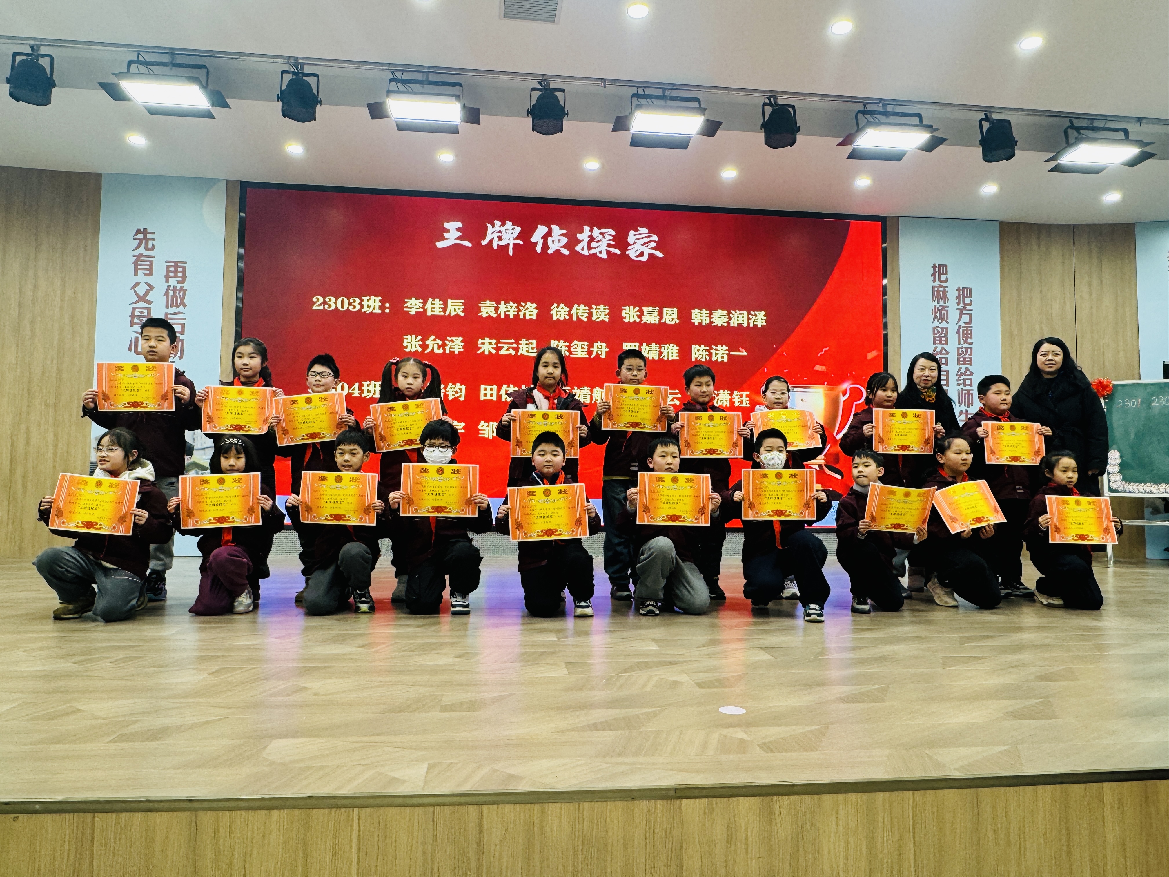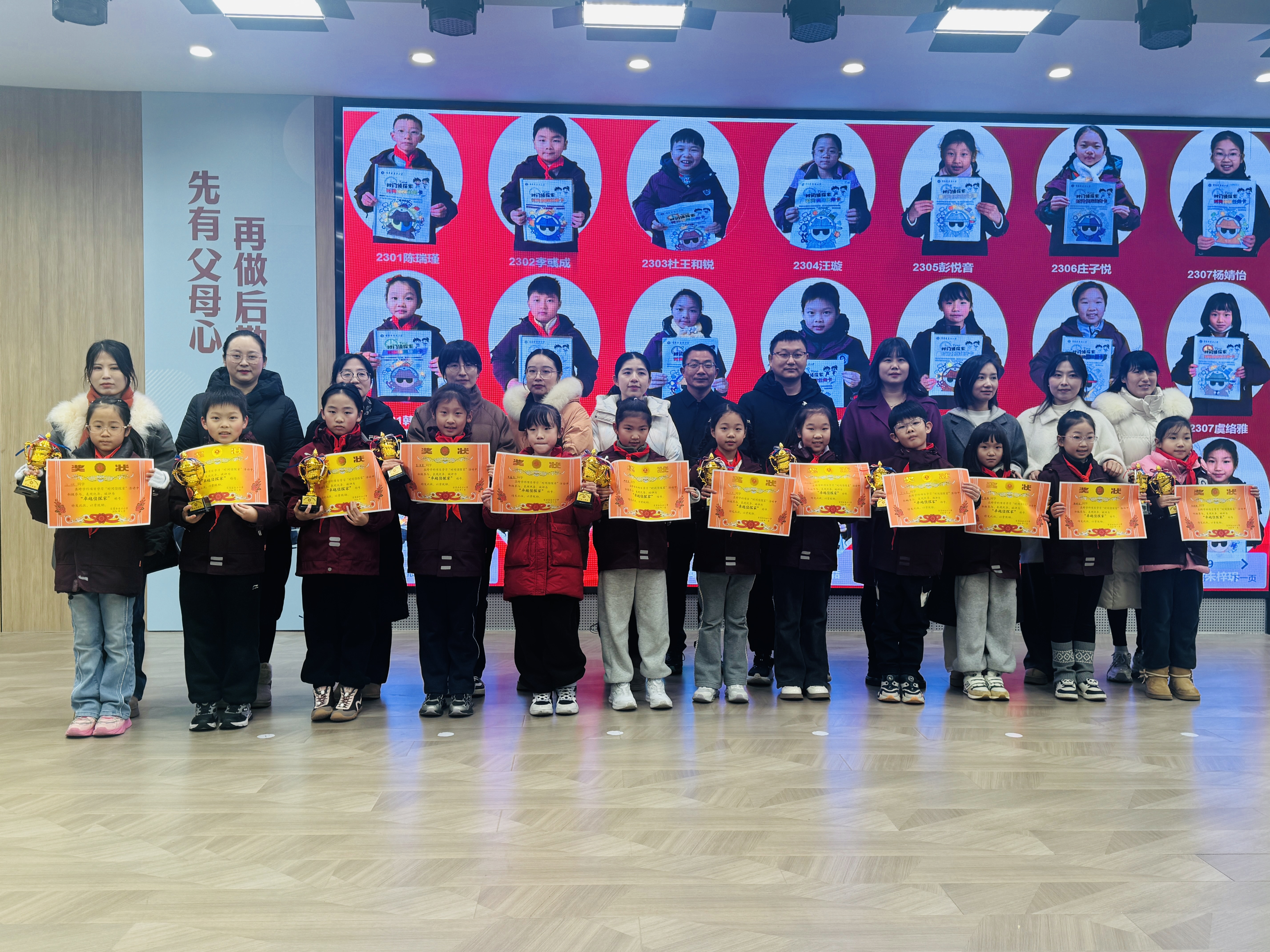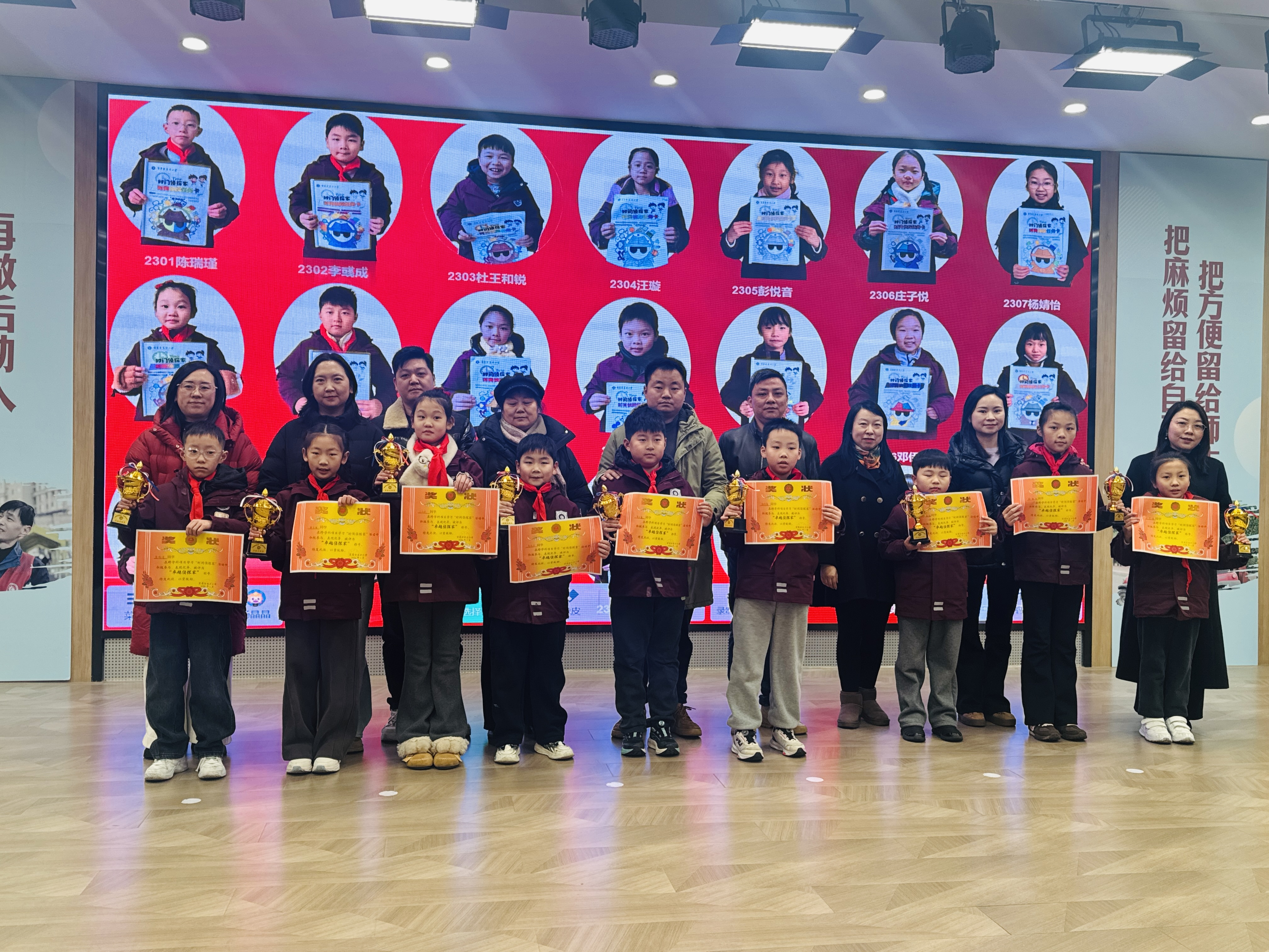 仪式上,学生代表分享了实践心得,从通过推算闰年破解“时间胶囊失窃案”,到运用24时计时法规划时间、实现“书包不回家”,趣味化任务让知识真正“活”了起来。随后,学校为各班“王牌侦探家””卓越侦探家“颁奖,充分肯定同学们在时间探索中的出色表现。