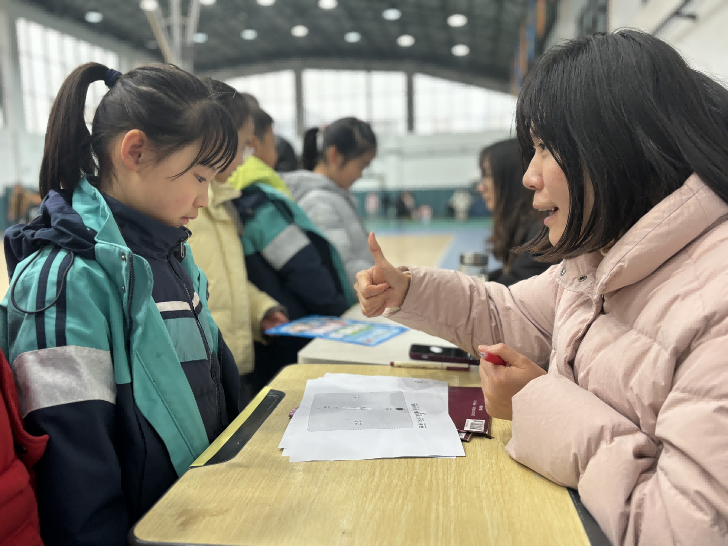 活动现场,同学们手持闯关集章卡,化身为“闯关小达人”,有序穿梭于各关卡之间。语文关“词语对对碰”考验词汇积累,“小小朗诵家”引导孩子用饱满情感流畅表达,“口语表达”环节则围绕生活主题,鼓励学生自由分享,锻炼逻辑思维与语言组织能力;数学关“算我能行”聚焦快速运算,巩固计算本领;科学关“太阳辨认方向”让学生在实践中运用知识;体育关“绳彩飞扬”则展现了孩子们的活力与坚持;英语关“声趣英语乐园”分为“我会唱”“我会读”“我会答”三部分,全面考察口语能力。五年级学长学姐担任“英语口测官”,一对一指导发音、纠正表达,耐心细致检查学习效果。同学们自信展示,用稚嫩而标准的英语唱歌、朗读、应答,赢得阵阵掌声。