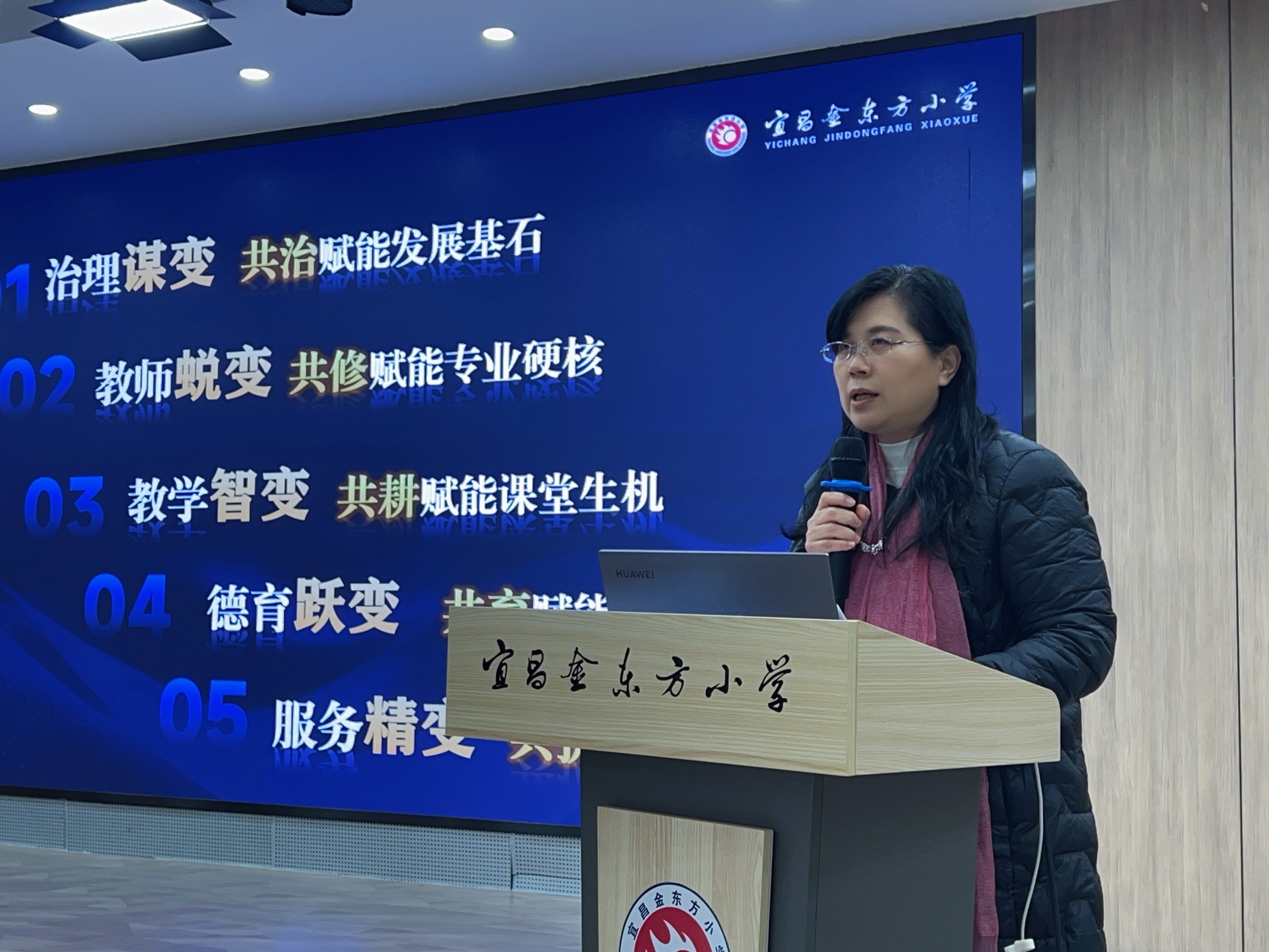 宜昌金东方小学党支部书记、校长胡书琴进行工作总结。她指出,本学期金小坚守“让每一个生命都发光”的办学初心,以变破局,赋能共生。伍家金小从治理谋变、教师蜕变、教学智变、德育跃变、服务精变五维发力,以共治赋能发展基石、共修赋能专业硬核、共耕赋能课堂生机、共育赋能品格闪光、共护赋能健康成长。