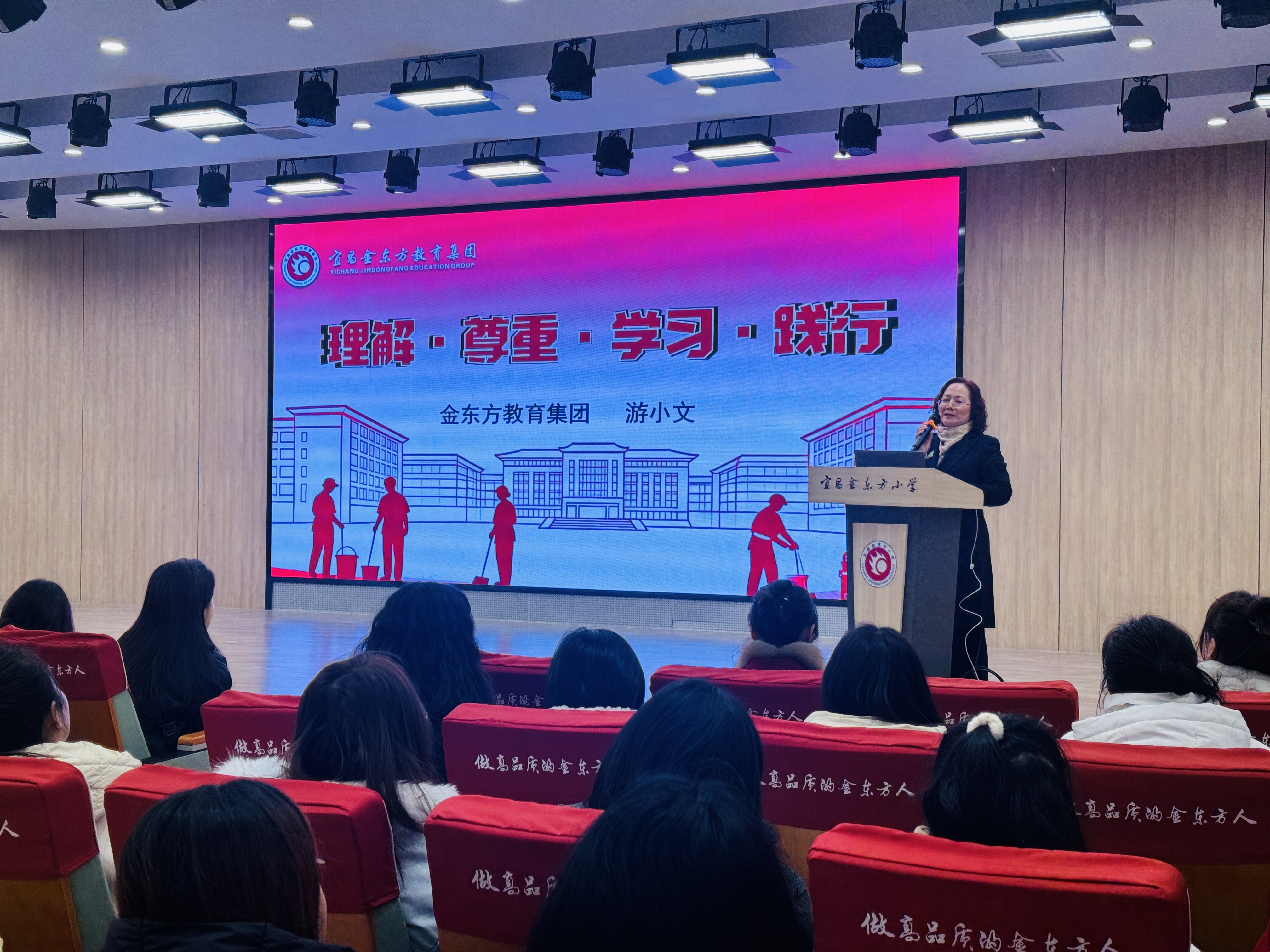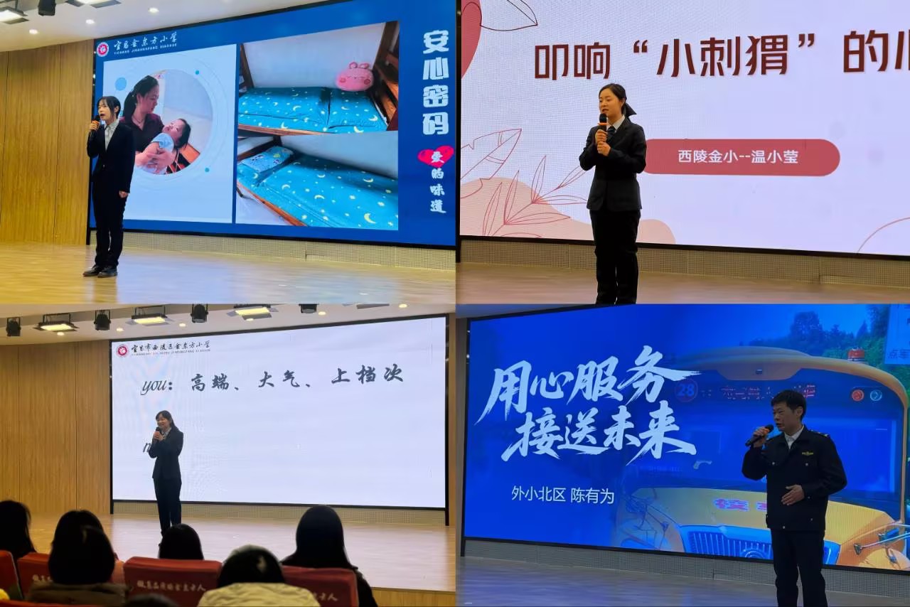 随后,学校举行“匠心服务,传递温暖”主题故事分享活动。在金东方后勤职工讲故事大赛中获得一二等奖的四位优秀代表——伍家金小涂舒舒、西陵金小陶卫文、西陵金小温小莹、外小北区陈有为,依次登台进行故事分享。他们用质朴的语言、真挚的情感,讲述了在日常服务中与孩子之间发生的温馨故事,一言一行之间,传递着后勤岗位特有的温暖与关怀。他们用行动证明,教育的温度体现在校园的每一个角落,师德的闪光绽放在每一位教育工作者身上。金东方教育集团监事长、督查考核部部长游小文对他们的分享给予高度肯定,赞扬活动办得扎实、故事讲得动人,并勉励全体教职工以他们为榜样,让温暖与匠心在校园持续传递。